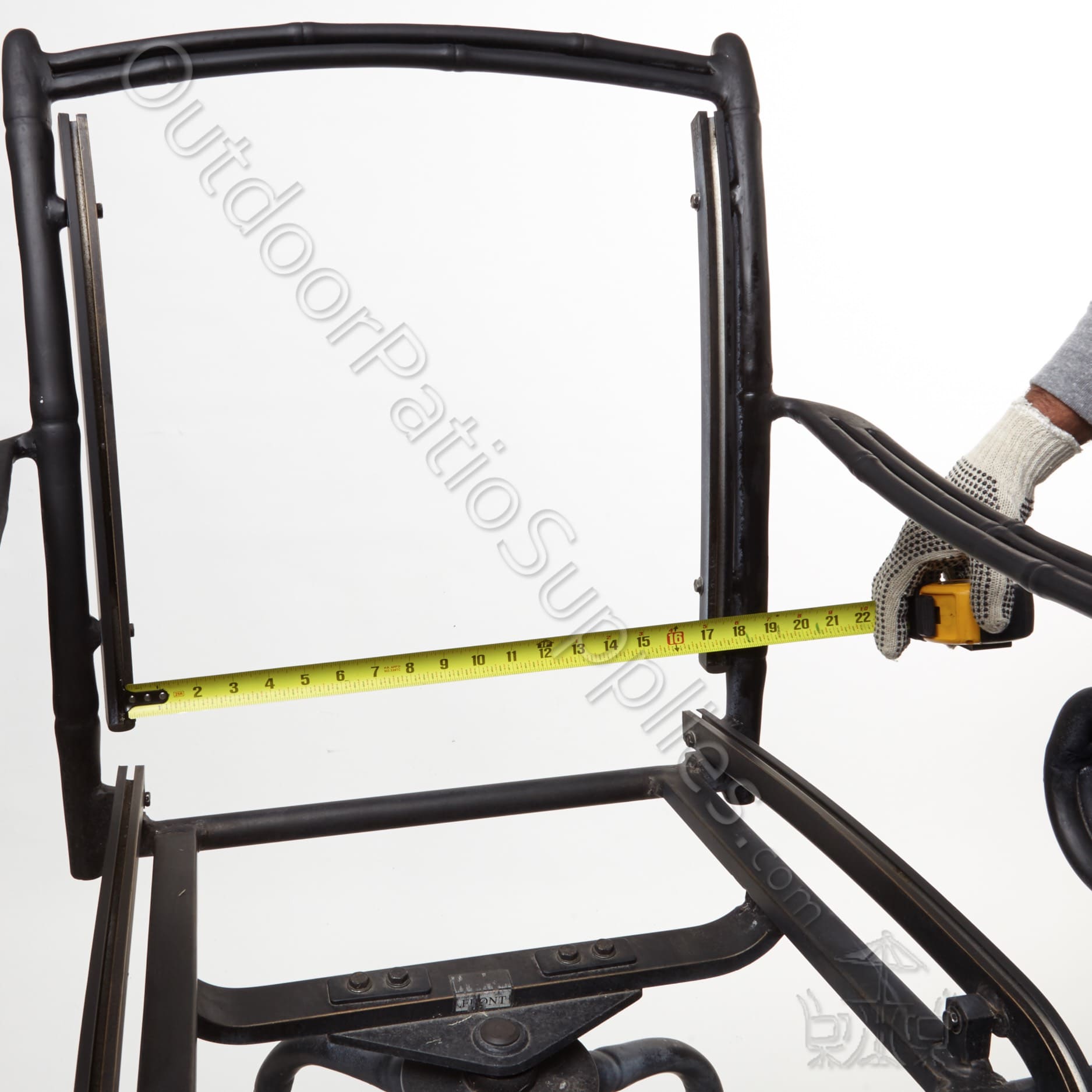 At the back of the chair’s seating area, position the tape measure in the center of one rail and measure straight across to the opposite rail, as shown in