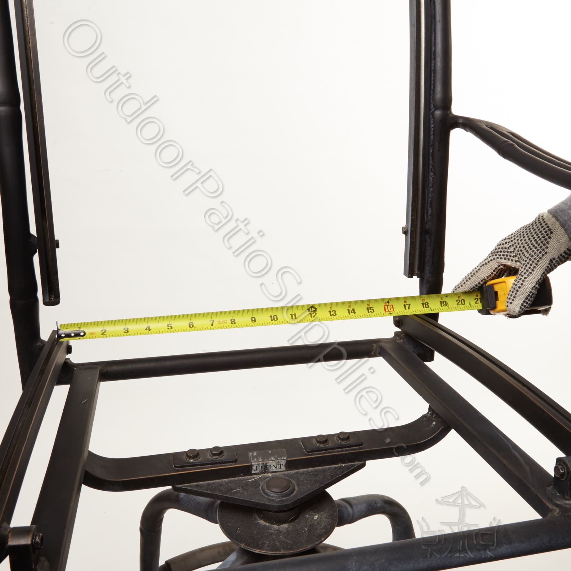 At the lower section of the chair’s backrest, position the tape measure at the center of one rail and extend it across to the opposite rail, as shown in