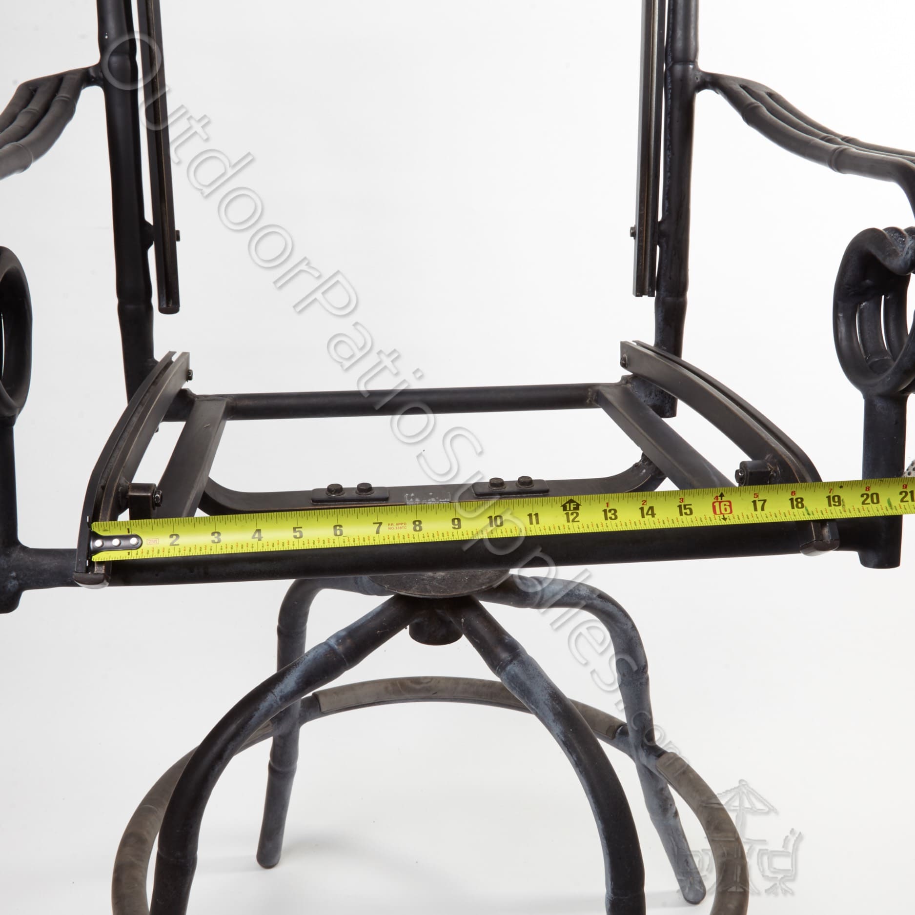 At the front of the chair’s seating area, align the tape measure at the center of one rail and extend it straight across to the opposite rail, as shown in